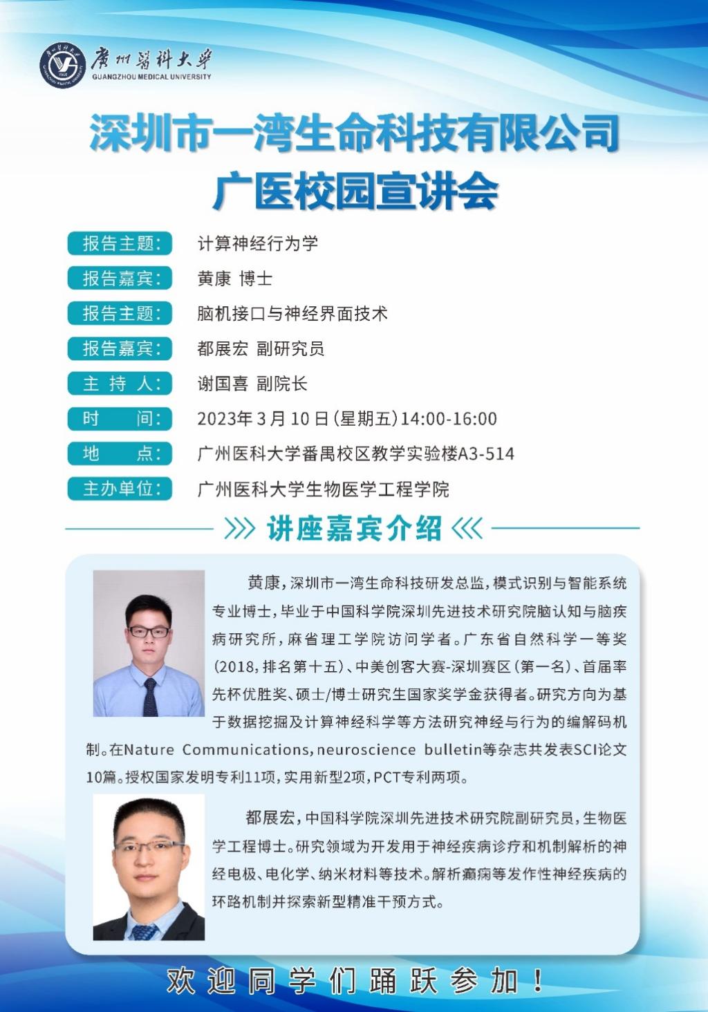 3月10日下午,深圳市一湾生命科技有限公司广医校园宣讲会在我校教学实验楼A3-514教室召开。深圳市一湾生命科技研发总监黄康博士、中国科学院深圳先进技术研究院副研究员都展宏作主题报告。谢国喜副院长主持会议。