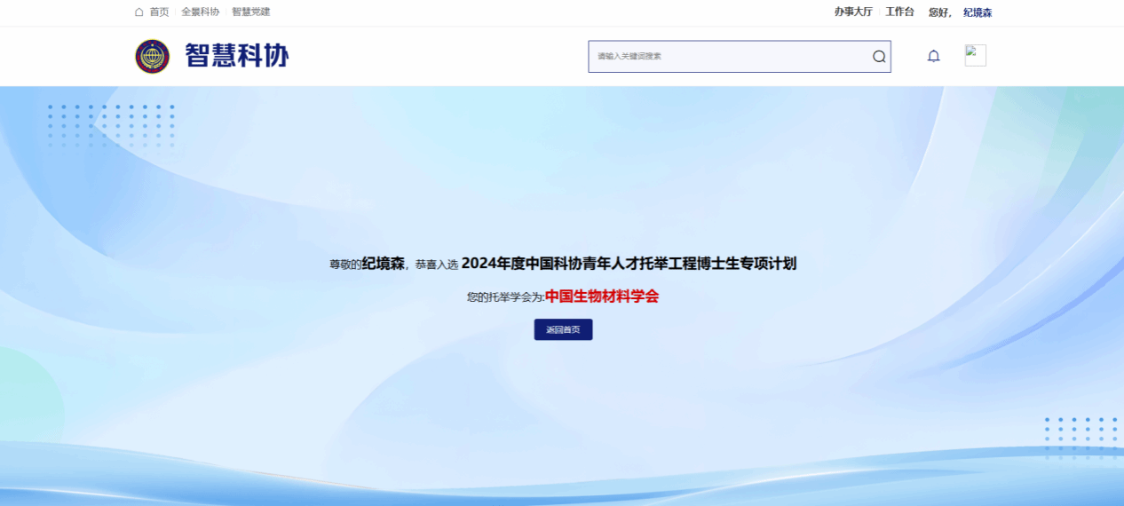 日前,中国科协办公厅发布2024年中国科协青年人才托举工程博士生专项计划入选者名单,我院纪境森博士(导师:梁兴杰/郭伟圣)成功入选,托举期为2025年1月至2026年12月,展现了我院在培养高层次科技人才方面的突出成就。