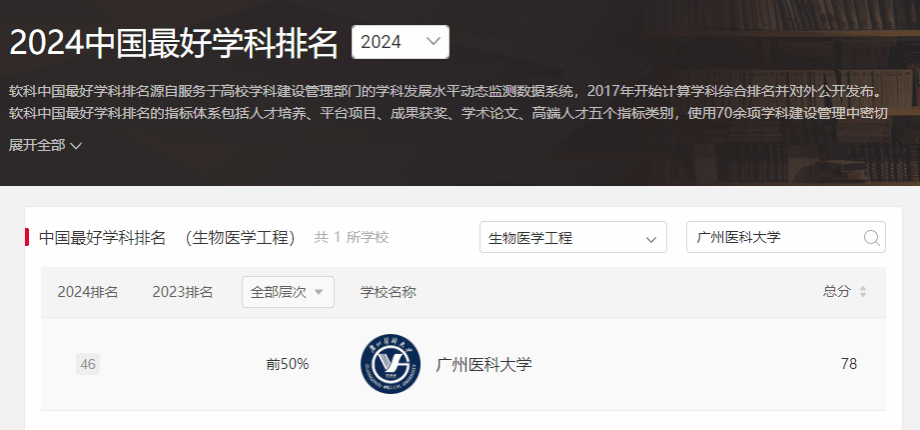 2024年11月11日,高等教育评价专业机构软科正式发布2024“软科世界一流学科排名”(Shanghai Ranking's Global Ranking of Academic Subjects)。广州医科大学生物医学工程学科 (Biomedical Engineering进入全球前100在国内独立医科院校排名第5。