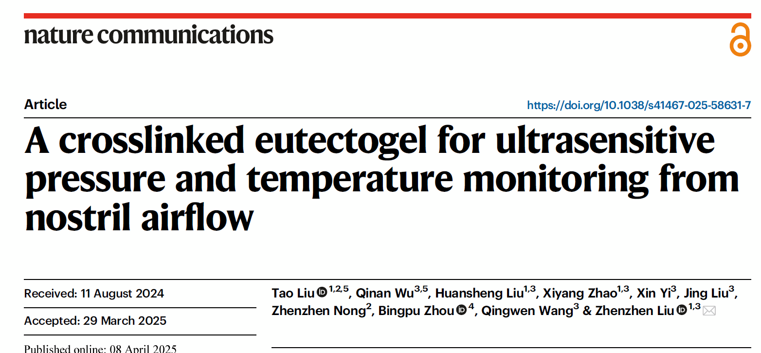 4月8日,我院刘珍珍教授及合作者在Nature Communications上在线发表了可精确监测鼻息气流的多模态呼吸传感器的研究论文A crosslinked eutectogel for ultrasensitive pressure and temperature monitoring from nostril airflow。刘珍珍教授为论文唯一通讯作者,广州医科大学为第一署名单位。