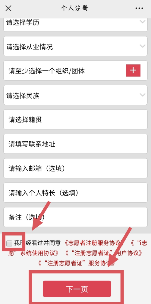 第四步:选择组织团体“广州医科大学无码人妻熟妇av又粗又大微阳志愿者服务队,勾选同意,点击“下一页”完成注册