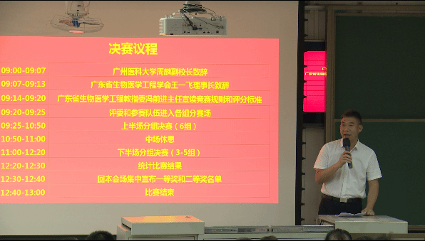 6月3日上午9点,竞赛开幕式上,广州医科大学周麟副校长首先致辞。周副校长代表学校对广东省生物医学工程学会、兄弟高校和社会各界给予的支持表示衷心感谢,对莅临会场的各位专家表示热烈欢迎,并预祝各参赛队伍在决赛中取得好成绩。他强调,广州医科大学承办本次比赛,为全省大学生搭建了一个生物医学工程学科的协同创新交流平台,有效推动了交叉创新人才的特色发展。希望大学生以本次大赛为契机,以赛会友,以赛创新,以赛促用,做新时代创新生力军,为健康中国、健康广东贡献力量。随后,广东省生物医学工程学会王一飞会理事长介绍了广东省大学生生物医学工程创新设计大赛的举办目的和宗旨——为生物医学工程及其相关专业的大学生和研究生提供了一个学术交流和展示平台,鼓励学生积极参与科技创新,勇攀科技高峰。广东省本科高校生物医学工程教学指导委员会冯前进主任宣布了比赛规则与注意事项,本次现场决赛实行全程网络直播,面向全省高校师生开放,决赛总成绩在主会场实时公布,为竞赛创造了一个公开、公正、公平的良好环境。