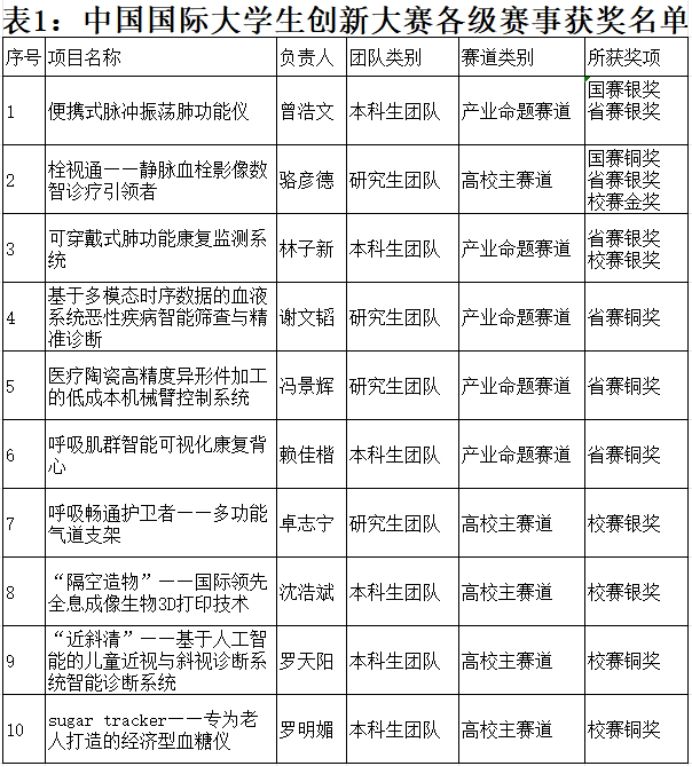 从2024年上半年开始,我院积极做好中国国际大学生创新大赛的组织培育工作,历经6月校赛,斩获校赛金奖1项、银奖3项及铜奖2项。8月在广东省赛中,再获省赛银奖3项、铜奖3项。2024年10月12日至15日,中国国际大学生创新大赛(2024)总决赛及其相关活动在上海圆满落幕,我院本科生团队和研究生团队从全国数万个项目中脱颖而出,荣获国赛银奖1项、铜奖1项,尤为值得一提的是,我院本科生曾浩文同学负责的“便携式脉冲振荡肺功能仪”项目团队在产业赛道中表现优异,荣获全国银奖,实现了学院在国家级奖项上的历史性突破,刷新了我院学生团队参与此项赛事以来的最佳成绩,其中产业赛道更是学校实现国家级奖项零的突破。