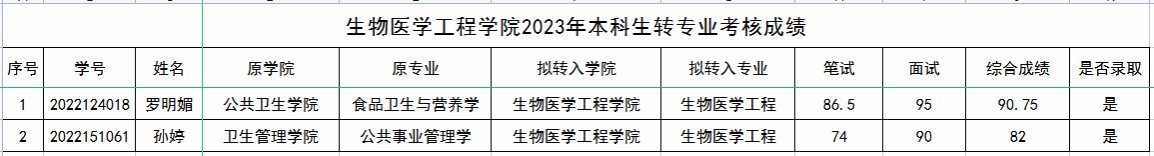 根据《广州医科大学普通全日制本科生转专业实施办法办法》(广医大发〔2021〕95号)和《生物医学工程学院转专业遴选执行细则》,现将我院2023年度本科生转专业接收考核成绩公示如下成绩见附件,依据考核成绩排名依次录取。